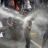 ▲ '4차 희망버스' 둘째날인 28일 오후 서울 용산구 갈월동 한진중공업 본사 앞에서 희망버스 참가자들이 도로를 점거한 채 한진중공업 정리해고 철회와 비정규직 철폐 등을 요구하며 기자회견을 진행하자, 경찰들이 물대포(살수차)를 발사하며 참가자들을 해산시키고 있다. |